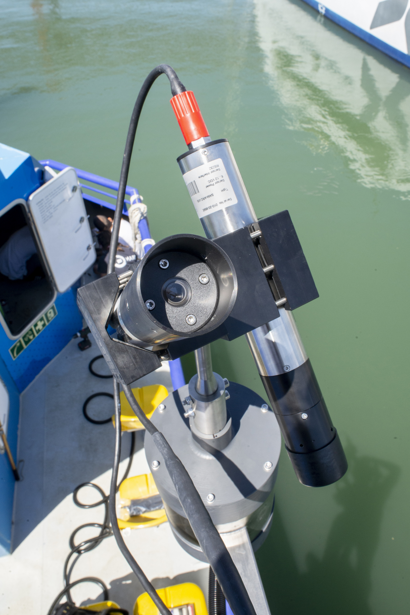 The equipment on the Lisboat ferry is called a "So-Rad radiometer", and uses three sensors ("TriOs") to measure the light reflected off the water and the incoming sunlight from above.